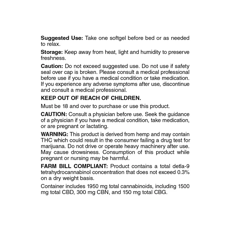 - 50mg CBD + 10mg CBN + 5mg CBG per serving